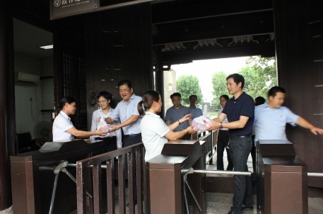 炎炎夏日,持续高温,给奋战在旅游一线岗位上的员工带来了严峻考验。8月6日下午,绍兴市文化旅游集团总经理胡华良、副总经理沈伟庆等一行冒着酷暑专程来到东湖景区看望慰问一线员工,给员工们带来一份份“清凉”的问候。